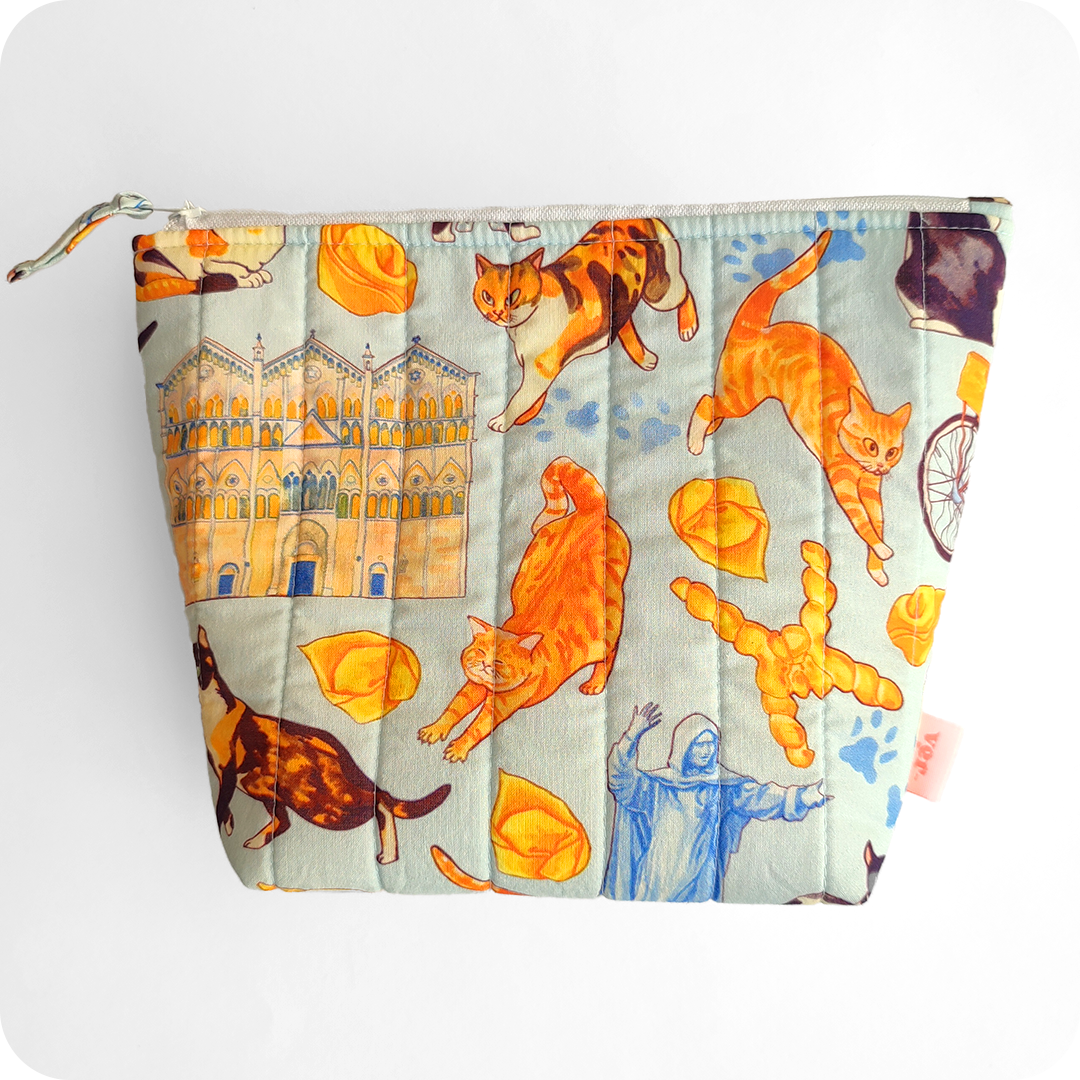 La nostra trousse ha un formato compatto ma capiente con una comoda cerniera con un laccetto cucito al cursore per aprirlo e chiuderlo velocemente. Il tessuto in cotone stampato visibile all’esterno è trapuntato con una sottile ma soffice imbottitura che dà una piacevole sensazione al tatto ed è in grado di proteggere il contenuto. All’interno è presente una fodera bianca.